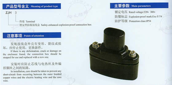 于2012.12.24整理發(fā)布。 上一產(chǎn)品我們就 防爆中間接線盒 做了詳細(xì)介紹和說明。 作為專業(yè)的電加熱生產(chǎn)廠家,專門為客戶設(shè)計(jì)、制造特殊型號(hào)的電加熱器,防爆電加熱器,普通電加熱器,防爆電熱管,油罐電加熱器,導(dǎo)熱油電加熱器,熱煤電加熱器及壓力容器,鑄銅鑄鋁防爆電加熱器,異型電加熱器,過濾油磁棒、格柵等等,規(guī)格齊全。 鎮(zhèn)江裕太防爆電加熱器有限公司 ,竭誠為您服務(wù)。 防爆終端接線盒用于電伴熱帶末端,使電伴熱帶的斷口與外界可靠隔絕。其外殼材料為DMC增強(qiáng)塑料制成。