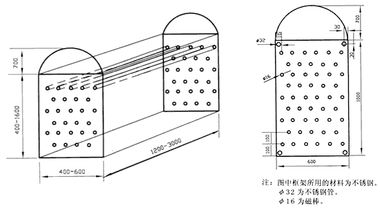 1、根據(jù)汽輪機(jī)主油箱及各油站的尺寸,用金屬材料制一框架,(最好使用不銹鋼),在框架的一對(duì)稱邊用卡子固定濾油磁棒,磁棒間隙80mm~100mm,磁場(chǎng)方向在框架的平面內(nèi),根據(jù)框架尺寸在油箱電焊框架滑道,可是框架從油箱內(nèi)方便提出,汽輪機(jī)油箱內(nèi)可裝多排磁棒,相鄰兩排磁棒,要互相錯(cuò)開排列,安裝的排數(shù)與油箱的大小和油內(nèi)所含雜質(zhì)多少有關(guān),應(yīng)以最后一排磁棒上基本無(wú)雜質(zhì)為準(zhǔn)。